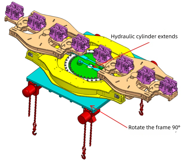 This system operates through a hydraulic rotary bearing mechanism. The hydraulic cylinder’s extension and retraction drives the inner ring of the rotary bearing, which rotates the swing frame mounted on it. This mechanism enables a full 0–90° rotation range, allowing the load to be repositioned from its original orientation to a perpendicular position in a single operation.