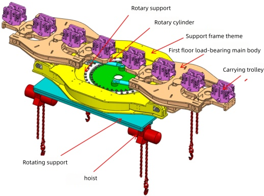 - Four lifting hoists — evenly distributed across the rotating frame, providing balanced four-point lifting for large-format loads such as hydraulic roof supports